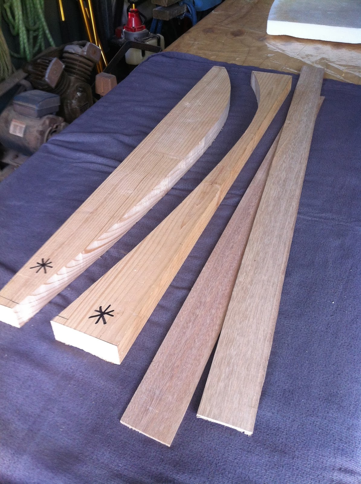 I made a jig out of scrap pine to glue the rails to the foam. I'll also use this jig to shape the rails after I steam them.